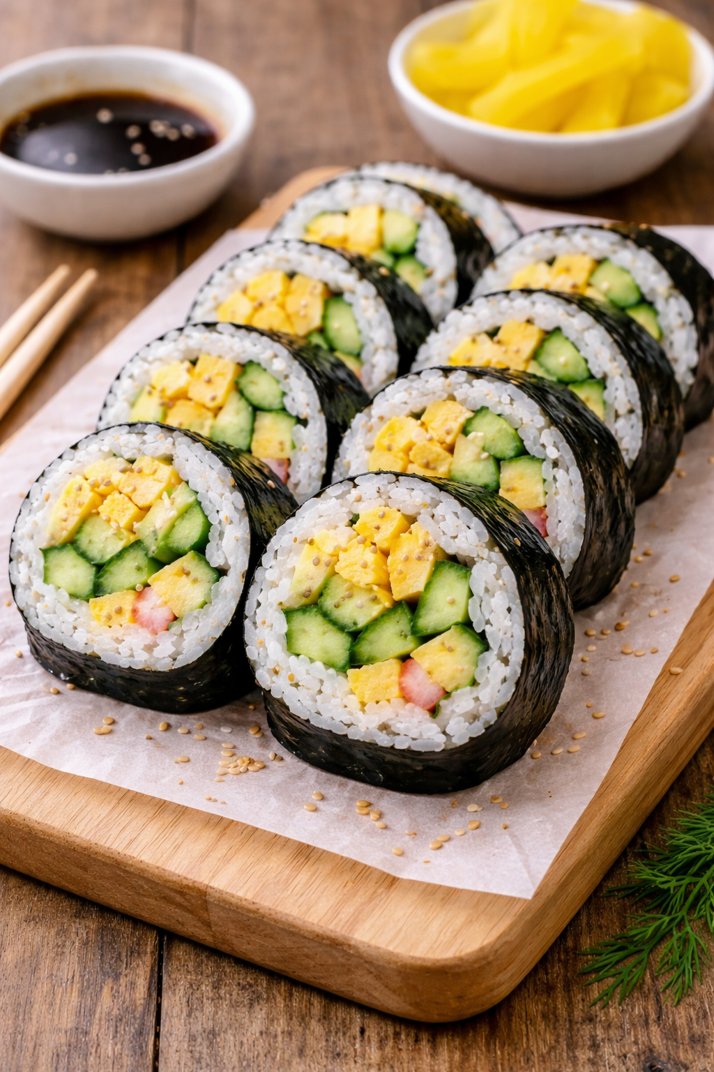 밥에는 참기름만 살짝 넣어 비빕니다. 설탕이나 식초는 넣지 않습니다. 단맛을 더하면 칼로리가 올라가고 산미를 더하면 오이의 신선한 맛과 충돌합니다. 김을 3등분해서 밥을 앞쪽에만 얇게 펴고 오이와 지단을 듬뿍 올려 말아줍니다.